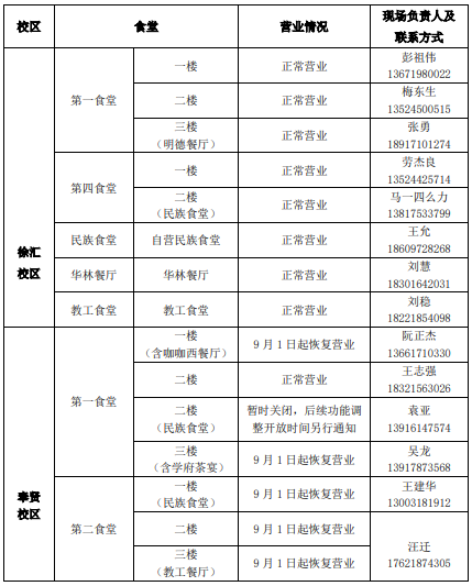 1. 徐汇校区餐饮服务监管电话:64252843,奉贤校区餐饮服务监管电话:33612488;