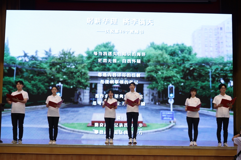 会上,学生表演原创诗朗诵《躬耕华理,桃李满天》,大学生合唱团演唱《再一次出发》,为第40个教师节献礼。