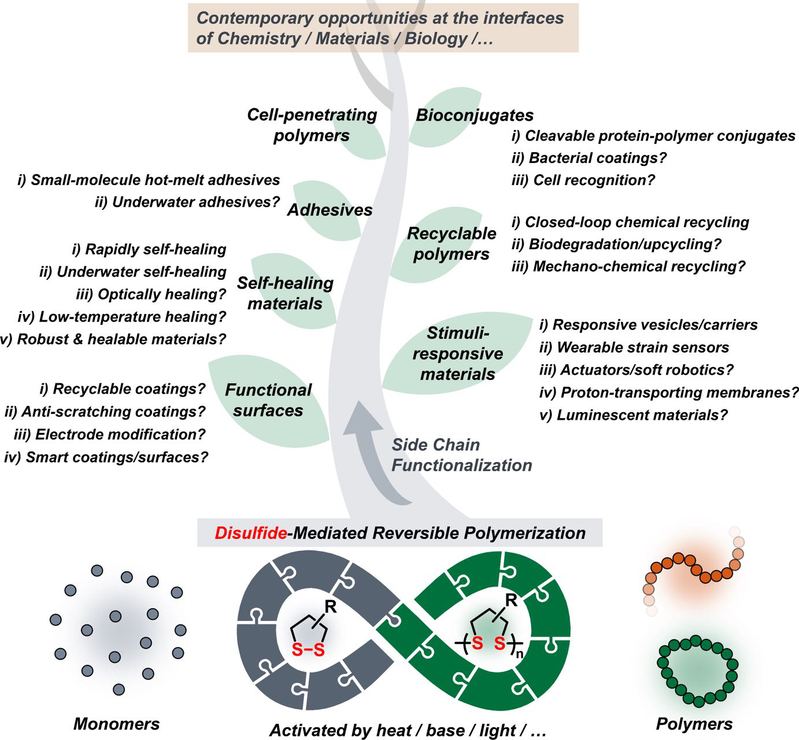In recent years, the research teams of Academician Tian He and Professor Qu Dahui of the School of Chemistry and Molecular Engineering, ECUST and Feringa Nobel Prize Scientists Joint Research Center, ECUST have developed a series of dynamic supramolecular materials based on natural micromolecule lipoic acid, and have made a series of progress in self-healing elastomers, orderly assembly of polymer films, chemical recovery of polymers and so on. Based on the previous leading work in this field, the research teams of Academician Tian He and Professor Qu Dahui were invited to publish a Perspective article “Disulfide-Mediated Reversible Polymerization Tower Intrinsically Dynamic Smart Materials” in Journal of American Chemical Society, summarizing and prospecting a series of work on materials application of dynamic covalent reversible polymerization of sulfur dioxide.