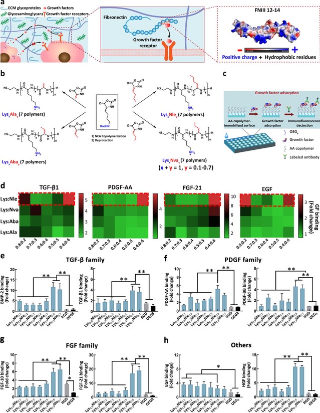 Recently, the research team of Professor Liu Runhui from the School of Materials Science and Engineering, ECUST made a breakthrough in the research field of random polymers simulating proteins with specific amino acid sequences and structures. Amino acid random copolymers were used to simulate fibronectin in extracellular matrix, which realized the function of efficiently and universally combining fibronectin with various growth factors. The research article was published in Advanced Science with the title of “Statistic Copolymers Working as GrowthFactor-Binding Mimics of Fibronectin”.