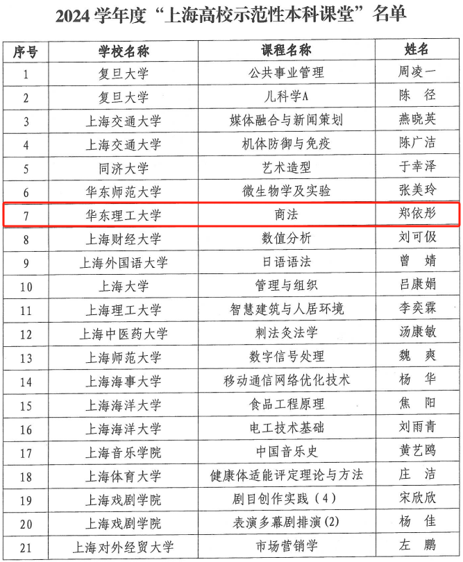 近日,上海市教育委员会下发《关于公布2024学年度“上海高校示范性本科课堂”名单的通知》(沪教委高〔2024〕54号),我校法学院郑依彤副教授的“商法”课程成功入选2024学年度“上海高校示范性本科课堂”。