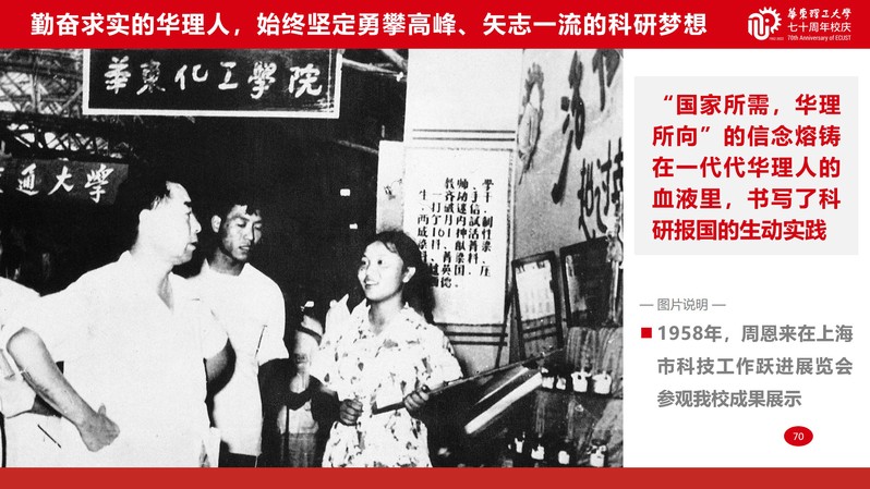 回望70年的办学历程,勤奋求实的华理人,始终坚定勇攀高峰、矢志一流的科研梦想。从朱正华临危受命研制国家高空飞行器专用材料,到苏元复提取稀有元素支援国家核工业建设;从刘馥英开发分子筛脱蜡技术填补能源化工行业空白,到李世瑨为国家高速飞行器研发专用薄膜;从焦扬声团队承担环氧树脂研制任务,为航天工业大国重器穿上“防护衣”,到于遵宏团队领衔开发出多喷嘴对置式水煤浆气化技术,改写中国煤气化技术依赖进口的历史。“国家所需,华理所向”的信念熔铸在一代代华理人的血液里,书写了科研报国的生动实践。