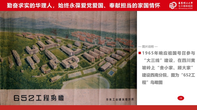 回望70年的办学历程,勤奋求实的华理人,始终永葆爱党爱国、奉献担当的家国情怀。从1952年新中国百废待兴、百业待举之际创建,到1965年响应祖国号召参与“大三线”建设,在四川黄坡岭上“舍小家、顾大家”建设西南分院,再到引领我国高等教育改革风气之先;从2008年组建上海第一支汶川地震灾后社工服务队,到2018年助力云南寻甸实现高质量脱贫摘帽,再到2022年疫情防控大上海保卫战,一代代华理人以殷殷家国情怀、拳拳赤子之心报效国家,在经济发展、学术繁荣、英才培养、社会服务和大国利器铸造中展现了华理担当。