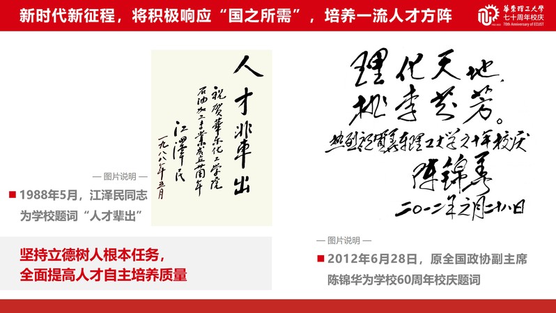 “惟其艰难,才更显勇毅,惟其笃行,才弥足珍贵。”建校70年来,不论是艰苦创业的筚路蓝缕、直面改革的坚韧以行,还是投身新时代的波澜壮阔,一代代华理人伴随着新中国的发展,始终保持不畏艰险、锐意进取的奋斗韧劲,风雨兼程、披荆斩棘、砥砺前行,在新中国高等教育史上谱写了与祖国同行、与时代共进的壮丽篇章。