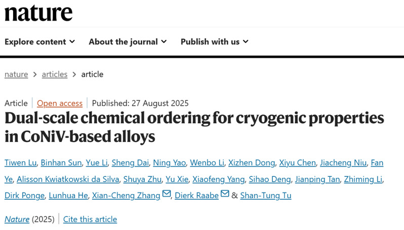 8月28日凌晨,BEAT365唯一官网机械与动力工程学院张显程教授、涂善东院士团队在Nature(《自然》)发表题为“Dual-scale chemical ordering for cryogenic properties in CoNiV-based alloys”的最新研究成果。
